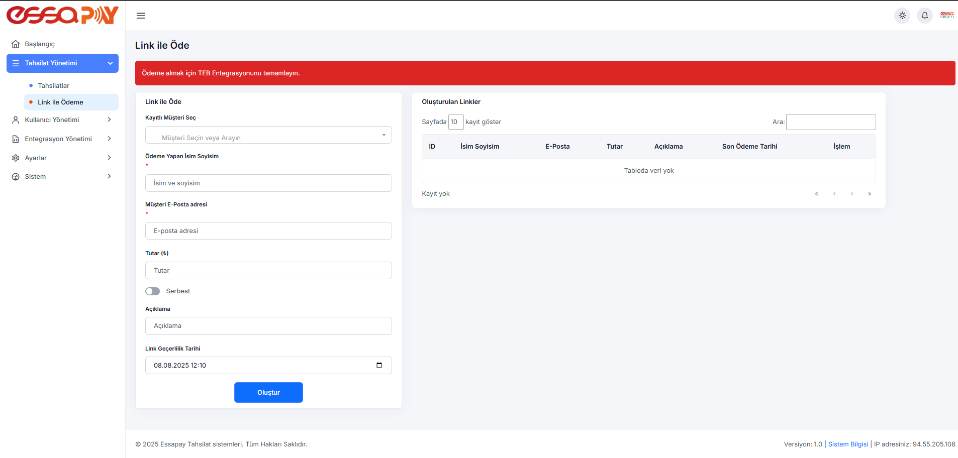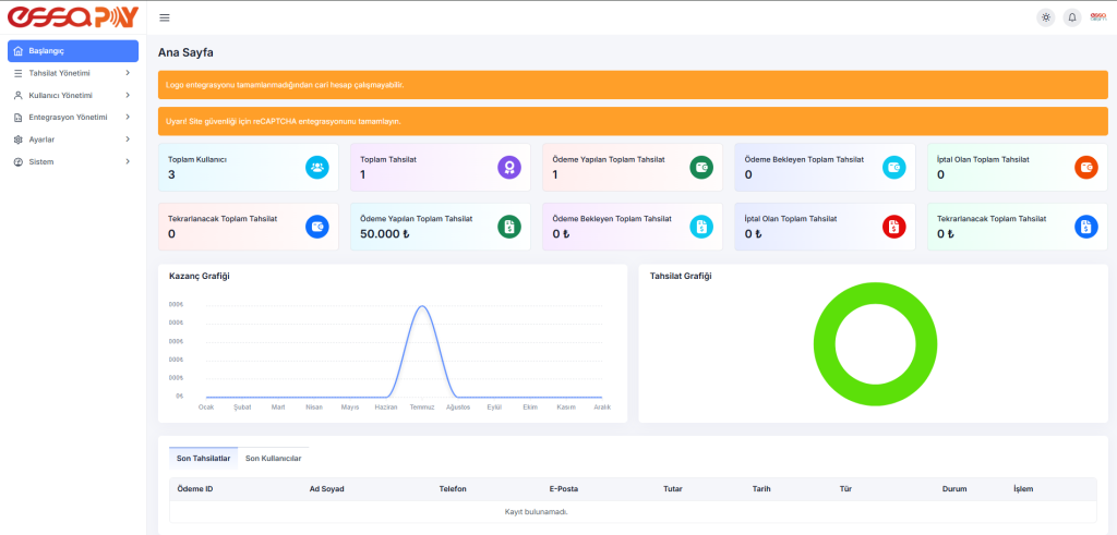 Banka API’si ile entegre çalışarak gelen tahsilatlar anlık olarak EssaPay paneline yansır. Dilerseniz e-posta veya SMS ile bildirim alabilirsiniz.